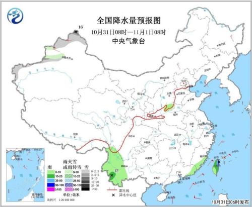 10月31日08时至11月1日08时,新疆西部和天山西部等地有小到中雪或雨夹雪,其中,阿勒泰北部局地有暴雪。云南中西部、华南东部和台湾岛等地有小到中雨,其中台湾东北部局地有大到暴雨。新疆西北部、内蒙古中部等地有4~6级风。(见图3)。南海东北部和中东部海域将有8~9级大风,阵风10~11级,“玉兔”中心经过的附近海域或地区的风力可达12级,阵风13~14级。