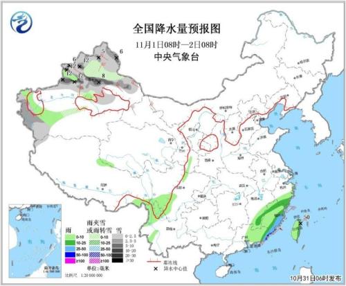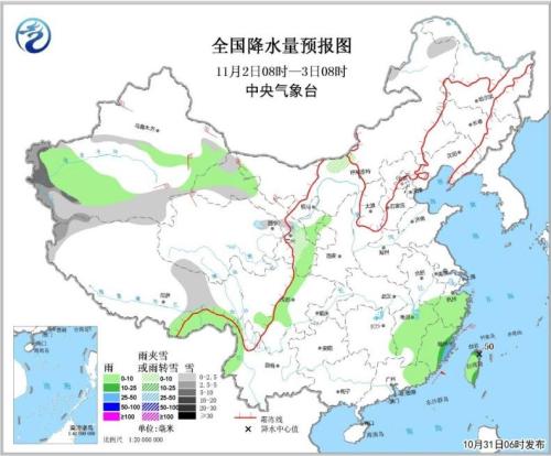 图3 全国降水量预报图(10月31日08时-11月1日08时)图片来源:中央气象台网站