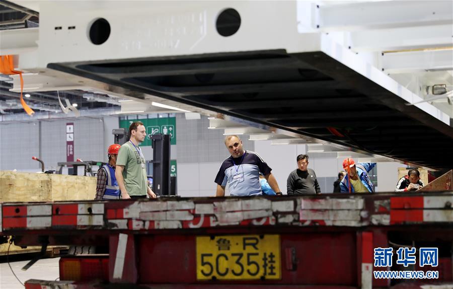 10月22日,德国工程师马丁·霍尔茨海德(中)在吊装过程中查看首届进博会最大展品——“金牛座”龙门铣床床身位置。新华社记者 方喆 摄