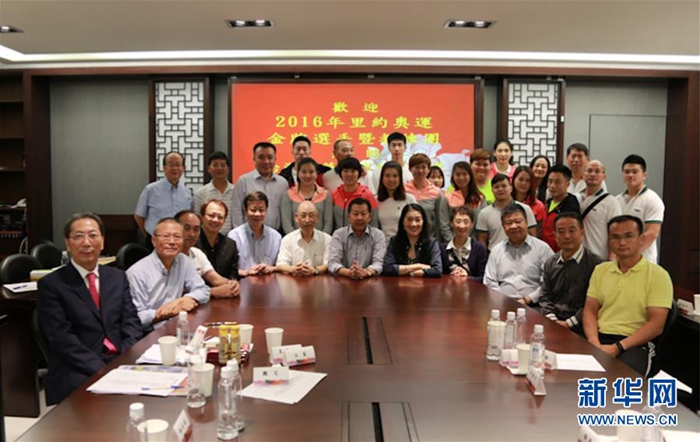 2016年,里约奥运会大陆金牌选手和教练交流团到“中华两岸经贸投资文化教育协会”座谈交流时合影。协会由黄紫玉(前排右五)在2009年发起成立,成为两岸民间交流的一个平台(受访者供图)。 新华社发