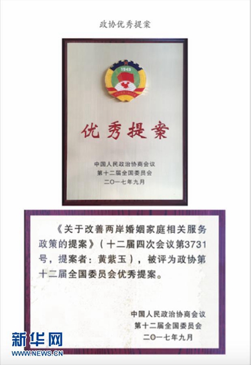 黄紫玉的《关于改善两岸婚姻家庭相关服务政策的提案》被评为政协第十二届全国委员会优秀提案(受访者供图)。新华社发