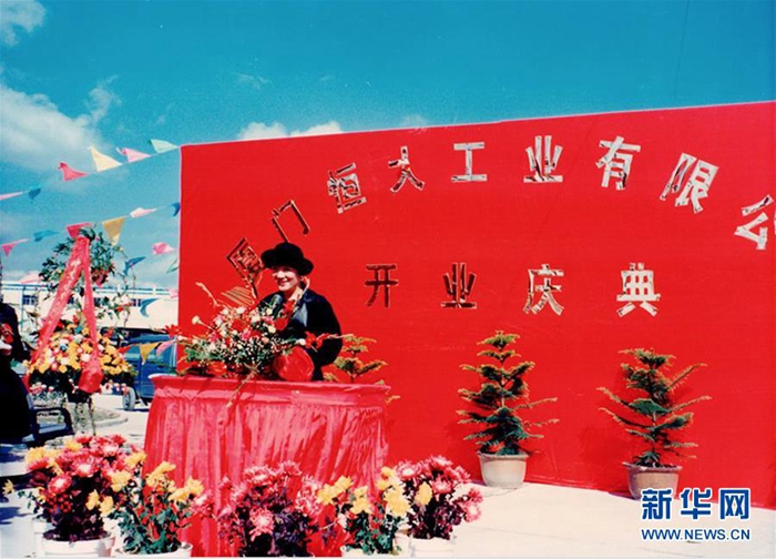 上世纪90年代初,黄紫玉在厦门的公司成立时站在红色背景板前讲话(受访者供图)。 新华社发