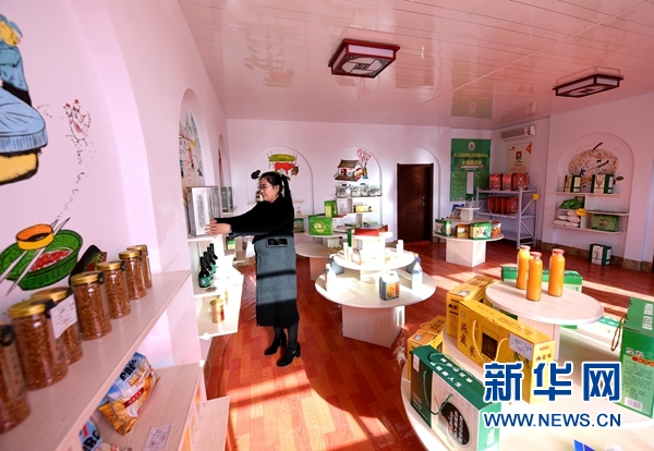 在山西省右玉县杀虎口村,村民王彩霞在杀虎口村生态旅游专业合作社内整理当地特产(10月25日摄)。新华社记者 杨晨光摄
