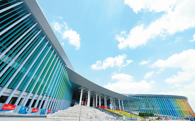 图为上海国家会展中心首届中国国际进口博览会现场,各国国旗、博览会会旗迎风招展,展会各项准备工作就绪。