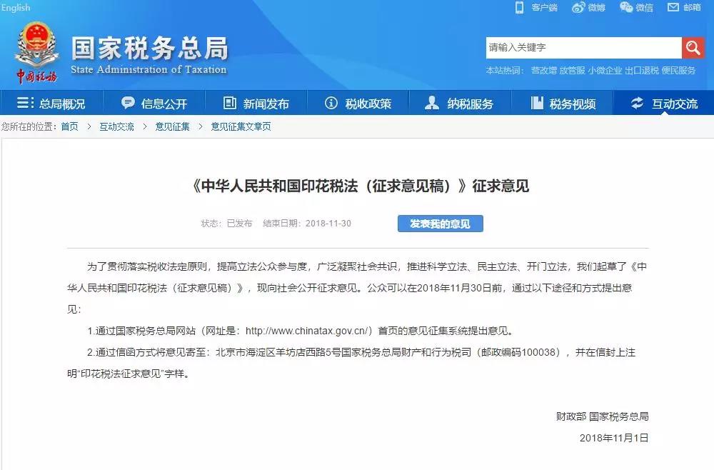 为了贯彻落实税收法定原则,提高立法公众参与度,广泛凝聚社会共识,推进科学立法、民主立法、开门立法,我们起草了《中华人民共和国印花税法(征求意见稿)》,现向社会公开征求意见。公众可以在2018年11月30日前,通过以下途径和方式提出意见: