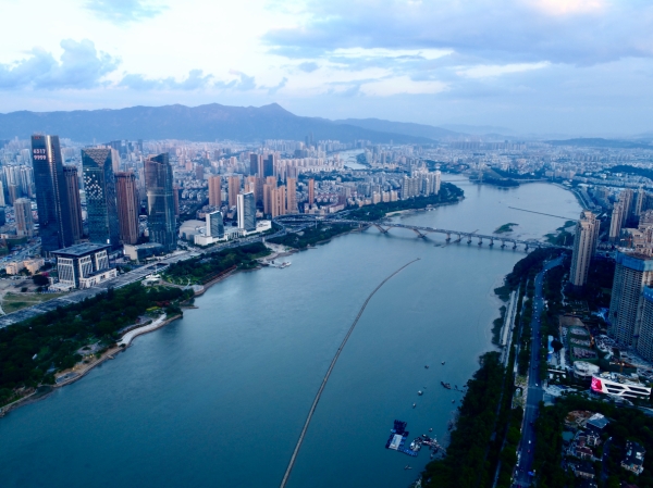 10月26日无人机拍摄的福州闽江两岸的夕阳美景。当日,福州天气晴好,傍晚时分的城区风景优美。新华社记者 姜克红 摄