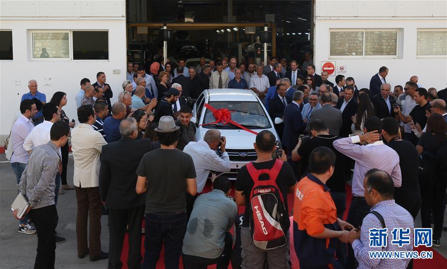 10月12日,在突尼斯苏塞的一个工业园内,一辆挂着中国品牌“吉利”标志的轿车正式下线。 新华社发(黄灵摄)