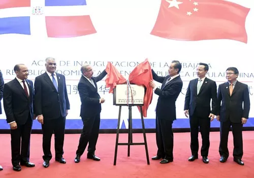 △11月3日,多米尼加共和国驻华大使馆在北京正式开馆。梅迪纳总统(左三)出席了开馆仪式。(来源于外交部网站)