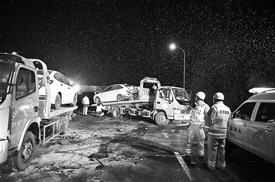 救援人员在兰海高速事故现场拖走损毁车辆 供图/新华社