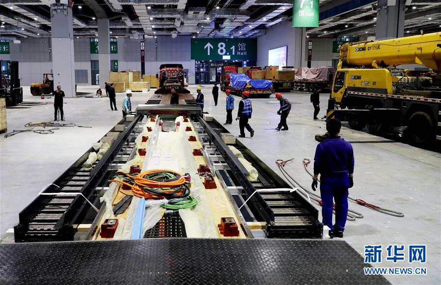 10月22日,“金牛座”龙门铣床床身(前)等待装运。 当日,来自德国的首届进口博览会最大展品——“金牛座”龙门铣床完成初步组装,将运往国家会展中心(上海)3号馆进行最后的安装施工。这是德国瓦德里??票す狙蟹⒌幕采璞?高约8米,占地面积约200平方米,将在智能及高端装备区进行展出。 新华社记者方喆摄