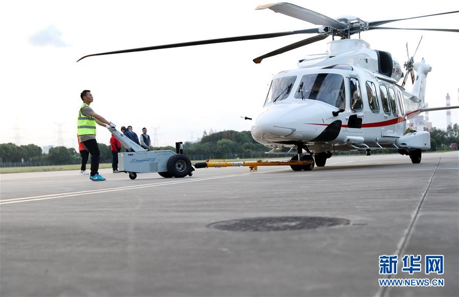 10月20日,参加进博会展出的意大利莱奥纳多直升机公司AW189型直升机降落在上海高东直升机场。新华社记者 方喆 摄
