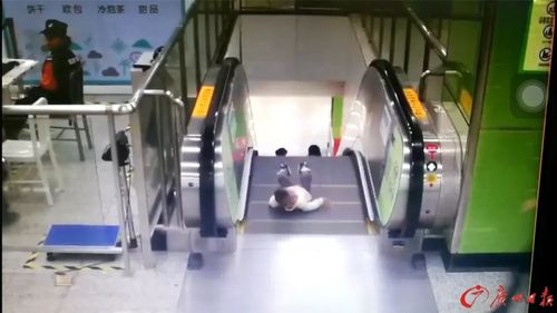 懵懵懂懂的孩子对下行的电梯很好奇,踩了上去。顿时,他被滚动的台阶吓着,一屁股墩儿坐倒,仰天八叉。
