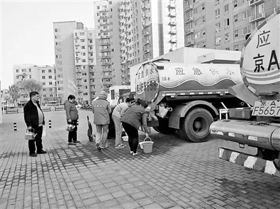 12日下午,北青报记者在馨瑞嘉园小区看到,12号楼前停放着两辆水车,几位居民正提着水壶、水桶等工具排队接水。一位居民告诉北青报记者,之前5号楼下也停着一辆水车。谈话间,一位居民已接好满满一桶水,用蓝色塑料桶提着往家走,看起来十分吃力。