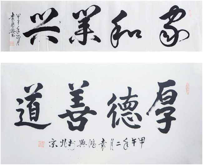 “家和万事兴”“百善孝为先”是袁老师书写最多的内容。他的书法风格,也体现在家教、家风方面。在他儿孙满堂的大家庭里,时时洋溢着其乐融融的氛围。他和老伴用勤劳的双手哺育了两儿、两女。如今孩子们已经成家立业,孙辈们也都学业精进。老人家在安享晚年的同时,时时关心着国家大事,他在不停地用自己的书法作品为时代讴歌?!安灰丝溲丈?,只留清气满乾坤”。袁鸿典老师的书法作品目前被多家博物馆和个人收藏,同时也走出了国门,走向世界。