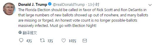 特朗普在推特发文称:“佛罗里达州的选举应该支持里克·斯科特和罗恩·德桑提斯,因为大量新选票不知从哪里冒出来,许多选票丢失或被伪造。诚实的选票计数已不再可能,因为大量的选票被污染?!?/p>