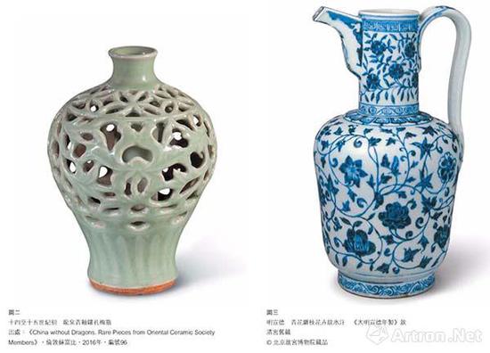 镂孔套瓶,或取思南宋杭州官窑,老虎洞窑址出土两胆瓶残器,可为佐证(杜正贤编,《杭州老虎洞窑址瓷器精选》,北京,2002年,图版24及25)。虽有先例,同处浙江的龙泉窑所制却更为世所识,有镂孔胆瓶及梅瓶传世。龙泉镂空套瓶,如今学界虽大致定为十四至十五世纪初之物,清代帝王多或归类为宋物。据乾隆八年(1743年)清宫造辨处档案,记“洋彩黄地莲环龙泉夹花玲珑罇一对……传旨着供各配架座”,可知类似瓷器昔时也以“龙泉”称之。