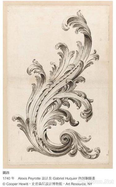 此玲珑尊肩上的黄地锦地洋花纹,起源却迥然不同。乾隆一朝,高宗复循先祖康熙皇帝(1662-1722年在位)之步履,召请来华传教士进宫供职献技,引入洋风西法,对当朝艺术亦有影响。器上曲卷叶纹,显然受法国帝君路易十五(1715-1774年在位)统治时西方流行之洛可可风影响。此玲珑尊上所饰卷叶,多称为苕茛,或借鉴法国设计师兼画家 Alexis Peyrotte(1699-1769年)之作。Peyrotte 曾参与凡尔赛宫、枫丹白露宫及马尔利庄园等室内设计,尤以“中国风”为人称道,可参考 Peyrotte 一幅苕茛叶饰纹铜版画,和此尊肩上图案尤为相近,版画创作于1740年,与此玲珑尊年代几乎一致(图四,Cooper Hewitt,史密森尼设计博物馆)。虽以西风入瓷,艺匠却未遵循欧洲常见的不对称设计,此瓶颈环饰洋花卷叶,配缀串珠,以及双鱼、吉庆、如意云头等中国传统图案,犹如项链规整对称。璎珞圆珠巧添光点,加上如意云头的渐层渲染,让玲珑尊更形立体。