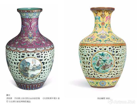 早于二十世纪初,此尊已现身纽约展售场上,距今已逾百年(图五及六),为一日本家族所藏。论纹饰搭配,此对玲珑尊举世无双,但台北故宫有藏器形与此相同之对瓶,可资比较,其“龙泉”镂空也与此吻合,却缺描金,器腹开光画山水,浮雕欠奉,瓶颈同画洋花,隙地却以红代黄。台北对瓶原为寿皇殿陈设器,寿皇殿位处景山正北,与正南之紫禁城坐落同一中轴上,乃历代清帝供奉祖上之所。台北故宫博物院另藏三件洋红地锦上添花龙泉描金夹层玲珑胆瓶,其中两瓶成对原伫端凝殿,另一则存紫禁城养心殿内。