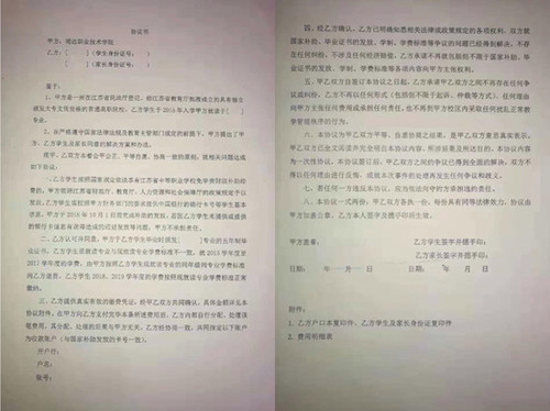 学校提供的协议书。受访者供图