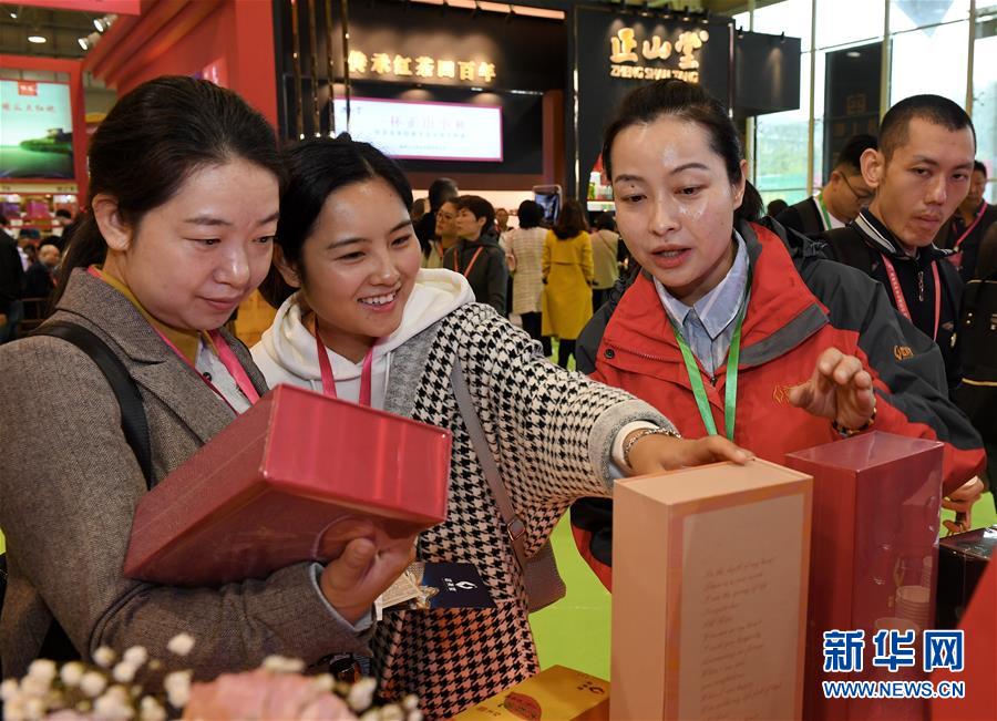 11月16日,茶商(右)在第十二届海峡两岸茶业博览会上推介武夷山茶。当日,第十二届海峡两岸茶业博览会在福建省武夷山市开幕。本届茶博会分为“茶文化”“茶养生”“茶食品”“茶旅游”等板块,共设展位一千多个,邀请采购商超过四千家。 新华社记者 张国俊 摄
