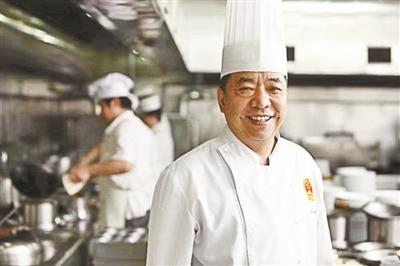 62岁的于晓波现在的厨师服上绣着国徽