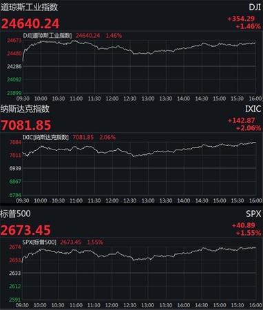 截至收盘,标普500指数收涨40.89点,涨幅1.55%,报2673.45点。道琼斯工业平均指数收涨354.29点,涨幅1.46%,报24640.24点。纳斯达克综合指数收涨142.87点,涨幅2.06%,报7081.85点。