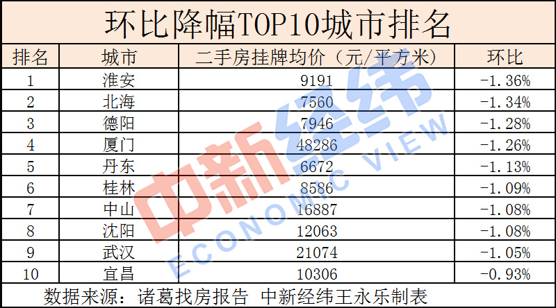 数据显示,淮安(-1.36%)、北海(-1.34%)、德阳(-1.28%)、厦门(-1.26%)、丹东(-1.13%)、桂林(-1.09%)、中山(-1.08%)、沈阳(-1.08%)、武汉(-1.05%)、宜昌(-0.93%)为环比跌幅TOP10城市。