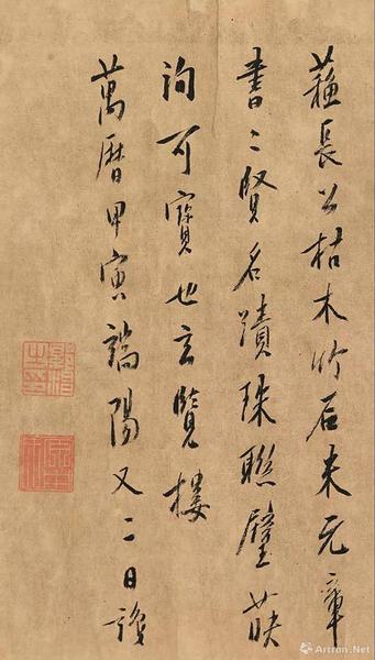 郭淐题跋 [苏长公枯木竹石米元章书,二贤名迹, 珠联璧映,旬可宝也!玄览楼。万历甲寅端阳又二日识。]
