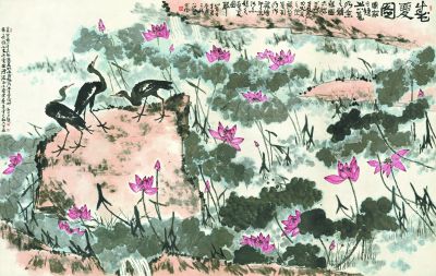观看此图,最好站在十米开外,才能充分感受到作品的气势。这气势不仅源于它的体量,来自于精心的布局,更来自于饱满的气韵。李苦禅自传统中走来,其命维新,在长方形的稳定中求险求奇。首先请看荷塘中石块的安排。最下方一带露出巨石的上部边缘,有溪涧倾泻而过。茂盛的荷花掩映其后。左侧一块方中有圆的巨石成为视觉中心点,周围铺满了荷叶与荷花。三只鹭鸶,站立石上,有昂首,有俯身,有扭转,姿态写真,给画面注入新的生趣。其中两只将我们的视线引向远处,那里有汩汩溪泉,泠泠作响,右上方一块巨石横亘而出,不仅呼应了画面最下边的岩岸,又给人一种出其不意的心理感受??囔壬簧白?,钟情于碑体,行草中不乏隶书之笔意。由此可悟,这一块突兀横生的巨石,犹如隶书中最重要的横笔,力度沉雄,气质古厚。石壁之上题跋抒情,恰得其所。巨岩正下方不远处有尖头坡岸作陪衬,极大深化了画面的空间层次感。荷叶蔓溯其间,劲拔生长,与几块巨岩的横向贯通之势形成了鲜明的对抗态势。这样,画面中既有横线,又有纵线,纵横交错,满塘生辉。从中国传统道家文化上讲,石为阳,荷为阴,一“硬”一“软”,使画中气脉流转,生命气象令人怦然心动。整幅作品横纵多姿,尤以横向开阔为主,不断将观者视线引向画外更广阔处。设色古雅,赭石与墨色交相辉映,朵朵红荷点缀其间,不由让人想到“接天莲叶无穷碧,映日荷花别样红”的景象。