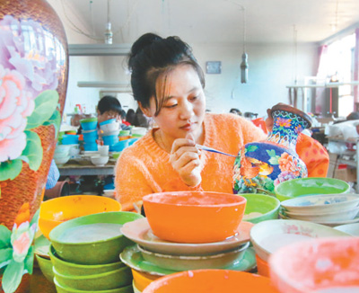 在制作车间,30余名女工按流水线作业,半成品的铜胎器在她们手中每完成一次交接,就意味着进入了下一个制作环节。李玉峰的任务则是当好监工。近两年,尽管是村办企业,但其产品已销售至京津沪,并出口海外。