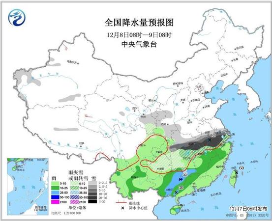 12月8日08时至9日08时,西北地区东部、江汉、江淮、江南北部等地的部分地区有小到中雪或雨夹雪,其中,江淮南部、江南东北部等地的部分地区有大雪或暴雪(10~12毫米)。江南中东部和南部、华南中西部、云南中部、海南岛、台湾岛等地的部分地区有中到大雨,其中,广西东北部和台湾岛东部等地的局地有暴雨(50~60毫米)。北疆北部和安徽中部等地部分地区有4~6级及以上风(见图4)。东海、台湾海峡将有7~8级、阵风9级的东北风。