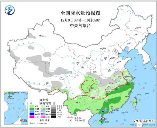 12月9日08时至10日08时,新疆南部和西部、西藏北部和东部、青海南部、黄淮南部、江淮、江汉、江南北部和西部、贵州、西北地区东南部等地的部分地区有小到中雪或雨夹雪。江南北部和东部、云南西南部、广西东部、广东西部和北部、海南岛等地的部分地区有中到大雨,其中,广西东南部和广东西南部局地有暴雨(50~55毫米)(见图5)。台湾海峡将有7~8级、阵风9级的东北风。