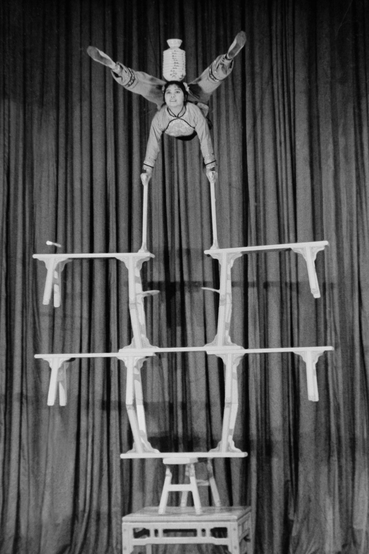 我觉得“顶碗”还有可以挖掘的潜力——由双手到单手、由静态到动态、由低处到高处,最重要的是碗能否离开头部、用脚夹出去后再夹回来?当时一天到晚就在想这件事儿,跟着了魔似的。“脚面夹碗”我从1960年开始练了三年,刚开始的时候不敢放太多碗,只能用砖头。有时候腿练得非常疼,上楼梯都吃力。1963年,我在民众乐园的舞台上表演,将这个新动作呈现给观众。第一次、第二次都失败了,到了第三次尝试终于成功,台下的观众纷纷站起来给我鼓掌。后来还有观众在寄给我的信中写道,我在前两次失败的情况下还毅然选择再来一次,这种不怕困难的精神值得大家学习。