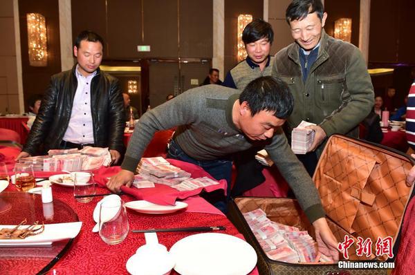 图为浙江义乌某公司为农民工兄弟发放年终工资及奖金。中新社发 吕斌 摄