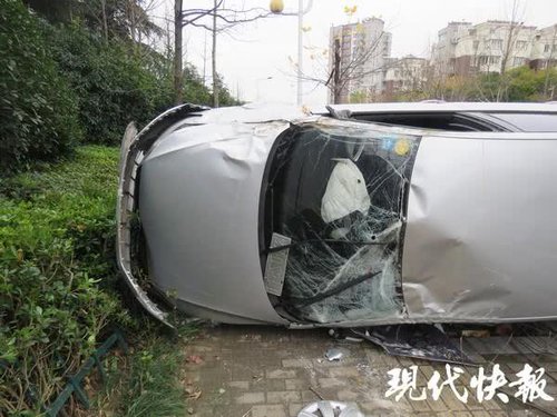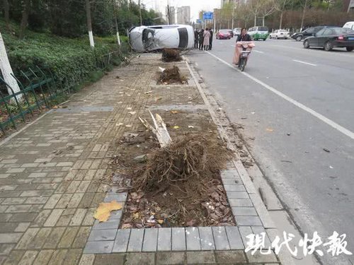 民警到达现场后,发现一辆银灰色轿车侧翻在路边人行道上,车旁的三棵树木都被撞断了,还被连根拔起,不远处还有一个被撞翻的垃圾箱,里面的垃圾也散落一地。