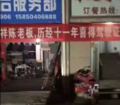 当天晚上,陈祥请了两桌朋友聚会庆祝。在他摆酒席庆祝的酒店门口,烟花鞭炮齐鸣,现场十分热闹,一条横幅上还写着"历经11年喜得驾驶证"等字样,过往路人无不稀奇。