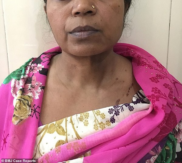 【环球网综合报道】据英国《每日邮报》12月7日报道,18年间,印度一位47岁妇女在下巴处长了一颗近9斤重的肿瘤,现已通过手术切除。