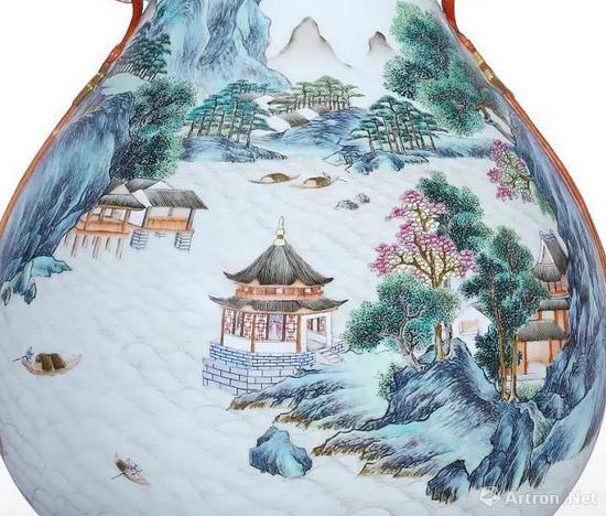 本品为乾隆官窑之中堪称别致的彩绘佳器,双如意耳精巧工致,如意首系有一装饰金彩“万”字的红色绶带,为乾隆朝高端精细御瓷琢器之显着标志??谘刈笆稳缫庠仆肺?,下承万寿飘带纹一周,正与双耳装饰相呼应。腹部绘山水庭院之景,画中远处宫阙耸立,飞檐翘角,苍松翠柏环绕,如云的宝塔傲立山峰之颠遥望长空,群山耸峙。施彩清薄妍美,设色淡雅隽永,益见苍雅深厚之感,观之宛如宋人之青绿山水翰墨,构建出乾隆御制诗句“轻舟浮水面,芳径引山家”之境。双耳造型与主题纹饰相呼应,寓意“江山万代”,可谓别具巧思。