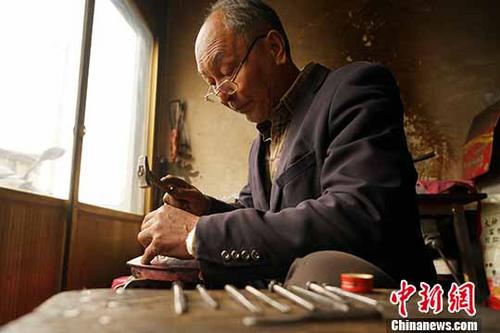 古城拉萨市北郊夺底乡的山脚下有一条长约1公里的无名街道,两侧是清一色的手工银器、铜器销售店。这条街道被少部分拉萨人称作白族银匠村,这里的银匠绝大部分来自云南省大理白族自治州鹤庆县。鹤庆银器锻制技艺拥有超过500年的历史,是中国国家级非物质文化遗产,在云南当地颇有名气。上世纪九十年代,一小批鹤庆银匠为了谋生,踏上了青藏高原,并在拉萨立足。图为64岁的洪中山在一块铜盖上雕滑纹。中新社记者 贡桑拉姆 摄