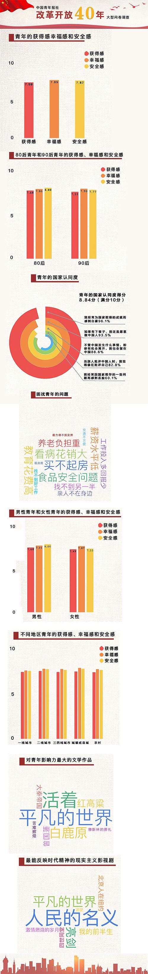 调查中,全体受访青年的获得感、幸福感、安全感,分别为7.59分、7.89分和7.82分。