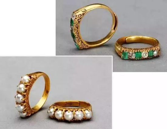 图中的这两款戒指,都是采用小颗粒的宝石并排镶嵌,配上黄金简直好看得不得了!就是在当今出门也是毫无压力的。