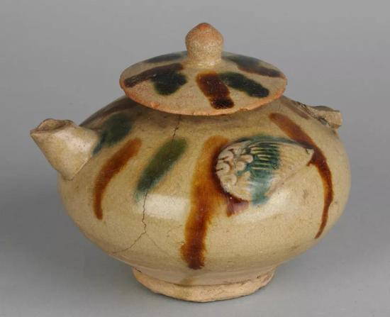 唐 长沙窑青釉褐绿条彩纹水注 高9厘米 长沙窑遗址出土 现藏于湖南省博物馆