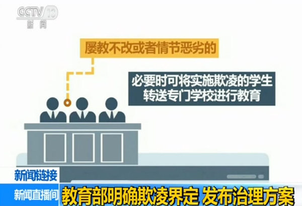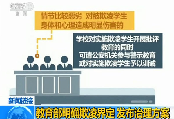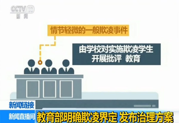 2017年11月,我国教育部等十一个部门联合印发了《加强中小学生欺凌综合治理方案》,明确了学生欺凌的界定,提出了预防的具体举措,规范了处置程序,对学生欺凌的不同情形明确了惩戒措施。根据方案,情节轻微的一般欺凌事件,由学校对实施欺凌学生开展批评、教育;情节比较恶劣、对被欺凌学生身体和心理造成明显伤害的,学校对实施欺凌学生开展批评、教育的同时,可请公安机关参与警示教育或对实施欺凌学生予以训诫。屡教不改或者情节恶劣的,必要时可将实施欺凌的学生转送专门学校进行教育;涉及违反治安管理或者涉嫌犯罪的,处置则以公安机关、人民法院、人民检察院为主。