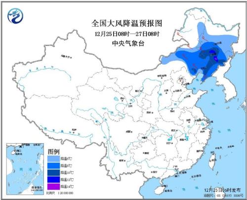 预计,12月25日08时至27日08时,内蒙古中东部、东北地区中南部等地气温将下降6~10℃,其中,吉林中西部、辽宁中部和西南部等地的部分地区降温幅度可达10~12℃,局地超过14℃,上述地区伴随出现4~6级风、阵风7~8级。