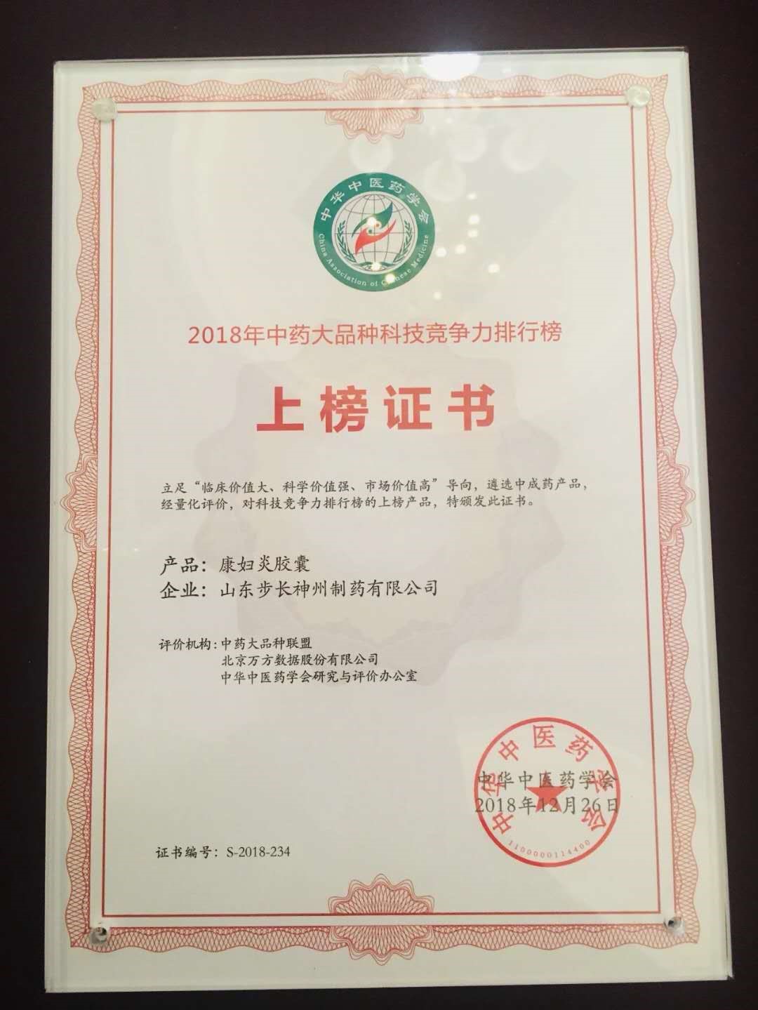 人民政协网北京12月26日电(记者 张春莉)2018年12月26日,“第四届中药大品种联盟论坛暨中药大品种科技竞争力排行榜发布会”在北京召开。步长制药生产的康妇炎胶囊荣获《2018年中药大品种科技竞争力排行榜上榜产品》荣誉。
