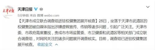 26日天津市武清区市场监管局表示,正在核实文章中反映的情况。27日下午,天津市成立联合调查组进驻权健集团展开核查。(完)