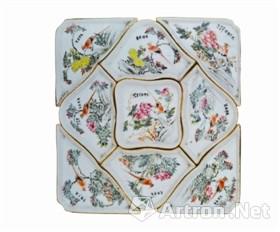 中国徽州文化博物馆收藏了一件许品衡绘制的粉彩果盘(见图),它由大小和形状不同的九个瓷盘子放在木盒里,组合成一个边长27.5厘米的正方形大果盘,俗称九子盘,也称攒盘。九个小盘有三种造型,有的如正方形,有的如磬,有的如三角形。小盘的外边线或为直线,或为凹凸状的弧线,这样的设计使盘子组合起来后相互紧密镶嵌,摆放在木盒中稳稳当当,不晃不动,足见工匠构思的巧妙。九个小盘的盘面内都由许品衡各绘一幅花鸟画,每个画面上都有一只绶带鸟与不同的花草树木组合,构成九幅精彩画面。九只绶带鸟千姿百态,或在枝头上鸣叫,或在花丛中栖息,或在巨石上探望,……只只活灵活现趣味无穷。它们或与牡丹花组合,或与牡丹菊花组合,或与牡丹竹子组合,或与牡丹紫薇组合,或与紫薇菊花组合,寓意富贵吉祥、平安长寿。九个盘子摆放在一起,顿觉鸟儿鸣唱,繁花似锦,姹紫嫣红,春意无限?;婀雇级啾?,布局轻灵,精工细雕,神采兼备,手笔不凡。题款有鸟啼花笑、鸟语花香、花下轻传,署名许品衡,作于丙申年(1896)。
