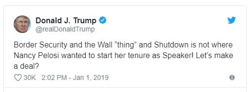 在众议院投票之前,事情有了一丝新的希望。据彭博社报道,特朗普向国会两党领袖发出邀请,邀请他们于周三(2日)赴白宫开会商讨边境墙事宜。收到邀请的包括,即将出任众院议长的佩洛西,众院民主党领袖霍耶,众院共和党领导层麦卡锡、斯卡利斯,以及参院民主党领导层舒默、德宾,参院共和党领导层麦康奈尔和图恩。