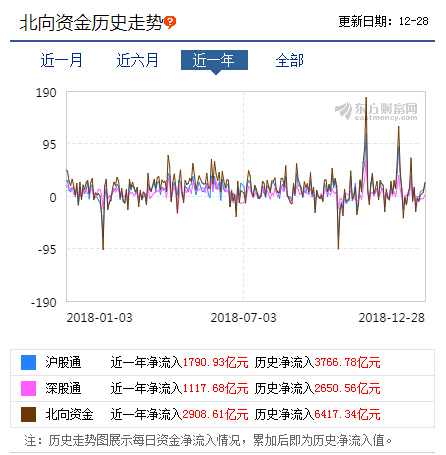 值得注意的是,去年以来,在A股市场整体下行的背景下,外资呈现出逆势流入的态势。东方财富数据显示,截至2018年12月18日的近一年时间里,北向资金净流入2908.61亿元。