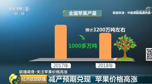 中国果品流通协会的统计数据显示,2018年全国苹果产量预计在3200万吨左右,相比2017年减产1000多万吨。